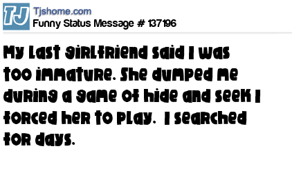 X says My last girlfriend said I was too immature. She dumped me during a game of hide and seek I forced her to play.  I searched for days.