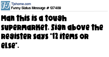 - # 180370 There is a new supermarket in town but I think it is run by the Mob. There are signs above the registers that say "12 items or else".