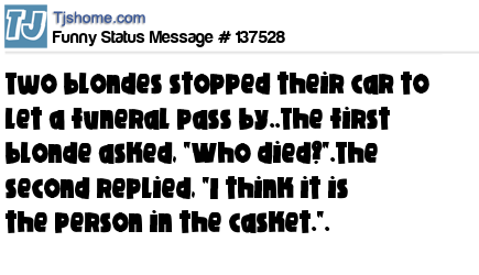 X Two blondes stopped their car to let a funeral pass by..The first blonde asked, "Who died?".The second replied, "I think it is the person in the casket.".