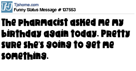 X says The pharmacist asked me my birthday again today. Pretty sure she's going to get me something.