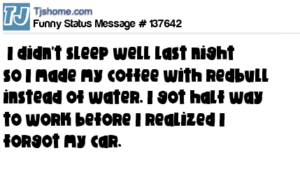 - # 147520 I DIDN'T SLEEP WELL LAST NIGHT, SO I MADE MY COFFEE THIS MORNING WITH RED BULL INSTEAD OF WATER.............I GOT HALF WAY TO WORK BEFORE I REALIZED I FORGOT MY CAR!!!