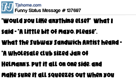 X says "Would you like anything else?" What I said - "A little bit of mayo, please". What the Subway Sandwich Artist heard - "A wholesale club sized jar of Helmann's, put it all on one side, and make sure it all squeezes out when you wrap it up."