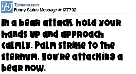 X says In a bear attack, hold your hands up and approach calmly. Palm strike to the sternum. You're attacking a bear now.