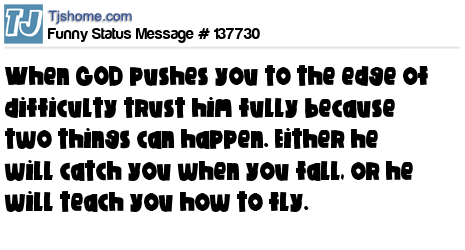 X says When GOD pushes you to the edge of difficulty trust him fully because two things can happen. Either he will catch you when you fall, or he will teach you how to fly.
