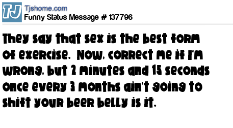 X says They say that sex is the best form of exercise. Now, correct me if I'm wrong, but 2 minutes and 15 seconds once every 3 months ain't going to shift your beer belly is it.