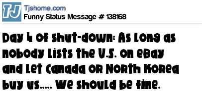 X Day 4 of shut-down: As long as nobody lists the U.S. on eBay and let Canada or North korea buy us..... We should be fine.