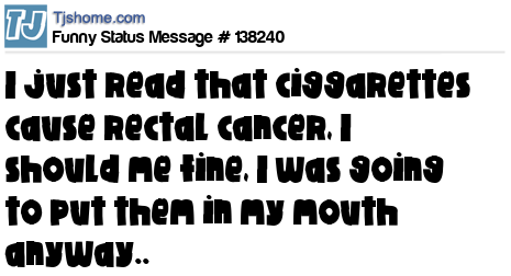 X says I just read that ciggarettes cause rectal cancer, I should me fine, I was going to put them in my mouth anyway..