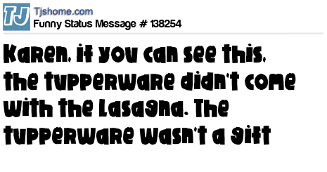 X Karen, if you can see this, the tupperware didn't come with the lasagna. The tupperware wasn't a gift
