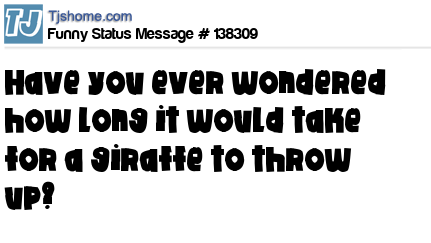 - # 86660 I wonder how long it would take a giraffe to throw up.