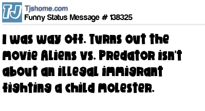 - # 85984 Damn, I was way off. Turns out Alien vs Predator isn't about an illegal immigrant fighting a child molester.