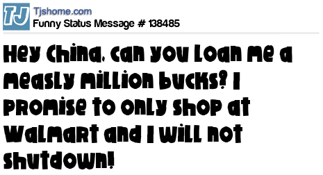 X says hey China, can you loan me a measly million bucks? I promise to only shop at Walmart and I will not shutdown!