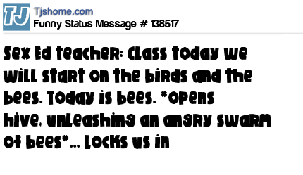 X Sex Ed teacher: Class today we will start on the birds and the bees. Today is bees. *opens hive, unleashing an angry swarm of bees*... Locks us in