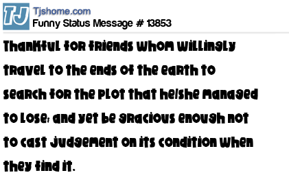 X is thankful for friends whom willingly travel to the ends of the earth to search for the plot that he/she managed to lose; and yet be gracious enough not to cast judgement on its condition when they find it.