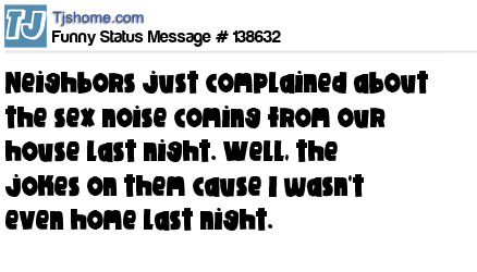 X says Neighbors just complained about the sex noise coming from our house last night. Well, the jokes on them cause I wasn't even home last night.