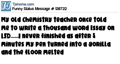 X says My old Chemistry teacher once told me to write a thousand word Essay on LSD......I never finished as after 5 minutes my pen turned into a gorilla and the floor melted