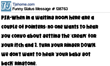 X says PSA-When in a waiting room here are a couple of pointers: no one wants to hear you convo about getting the 'cream' for your itch and 2. turn your ringer DOWN, we don't want to hear 'your baby got back' ringtone.