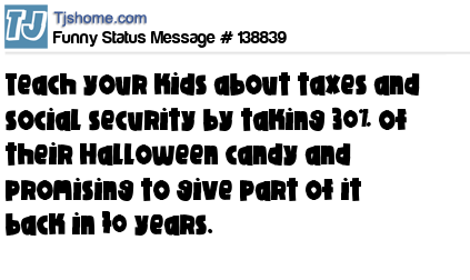 - # 139403 Teach your kids about taxes and social security by taking 30% of their Halloween candy and promising to give part of back in 70 Years..