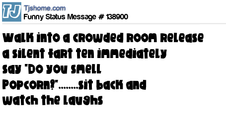 - # 189028 In a crowded room I like to let out a silent but deadly fart then shout "do I smell popcorn" so everyone gets a good whiff!