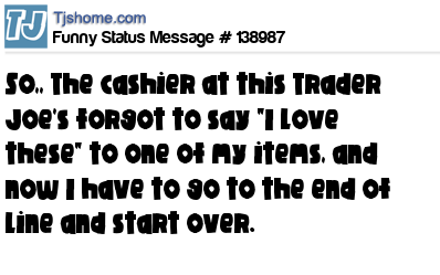 X So,, The cashier at this Trader Joe's forgot to say "I love these" to one of my items, and now I have to go to the end of line and start over.
