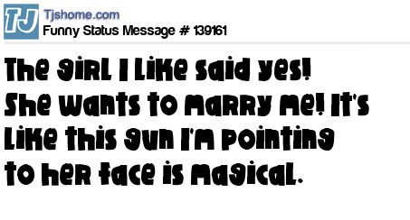 X says The girl I like said yes! She wants to marry me! It's like this gun I'm pointing to her face is magical.