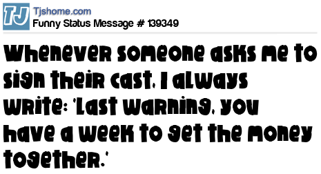 X says Whenever someone asks me to sign their cast, I always write: 'last warning, you have a week to get the money together.'