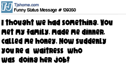 - # 127647 I thought we had something. You met my family, made us dinner, called me honey. Now suddenly you’re a “waitress” who was “doing her job?”