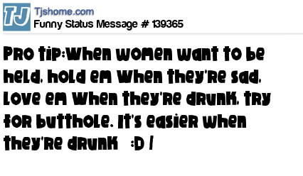 - # 139366 Pro tip:When women want to be held, hold em When they're sad, love em When they're drunk, try for butthole. It's easier when they're drunk :D /