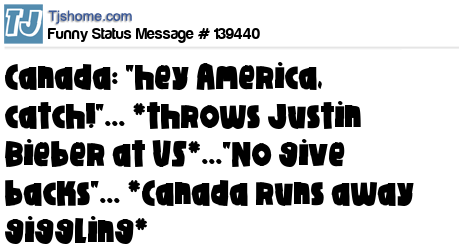 X Canada: "hey America, catch!"... *throws Justin Bieber at US*..."No give backs"... *Canada runs away giggling*