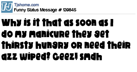 X Why is it that as soon as I do my manicure they get thirsty hungry or need their azz wiped? Geez! smdh