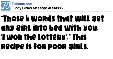 - # 139865 Those 4 words that will get any girl into bed with you. 'I won the lottery'.