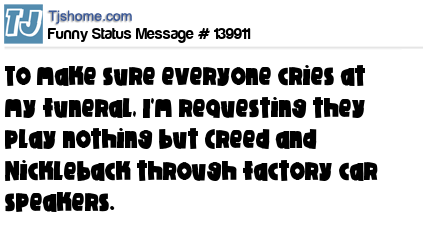 - # 199704 Play Nickleback during my funeral. Because I want everyone who attends to really cry.