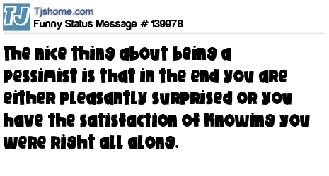 X says The nice thing about being a pessimist is that in the end you are either pleasantly surprised or you have the satisfaction of knowing you were right all along.