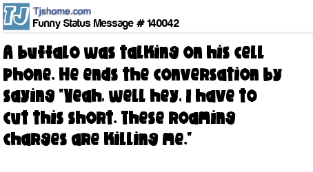 - # 135122 A buffalo was talking on his cell phone. He ends the call by saying "Yeah, well hey, I have to cut this short. These roaming charges are killing me."