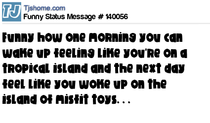 - # 140060 Funny how you can wake up feeling like you're on a tropical island, only to figure out later that it's the island of misfit toys.