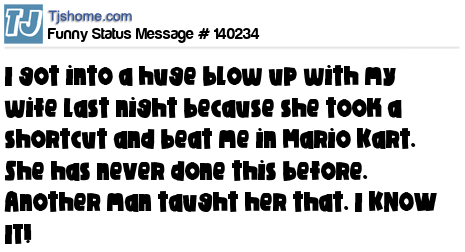 X says I got into a huge blow up with my wife last night because she took a shortcut and beat me in Mario Kart. She has never done this before. Another man taught her that. I KNOW IT!