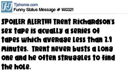 X says SPOILER ALERT!!! Trent Richardson's sex tape is acually a series of tapes which average less than 2.9 minutes. Trent never busts a long one and he often struggles to find the hole.