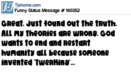 X Great, just found out the truth. All my theories are wrong. God wants to end and restart humanity all because someone invented 'Twerking'...