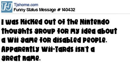 X says I was kicked out of the Nintendo thoughts group for my idea about a Wii game for disabled people. Apparently Wii-Tards isn't a great name.