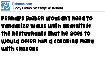 X says Perhaps Bieber wouldn't need to vandalize walls with graffiti if the restaurants that he goes to would offer him a coloring menu with crayons