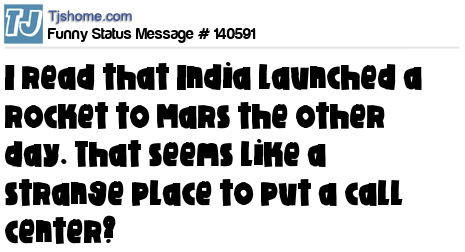 - # 153162 Congratulations India on successfully orbiting a probe around Mars. I assume you'll be opening call centers on the red planet and using fake Martian names now?
