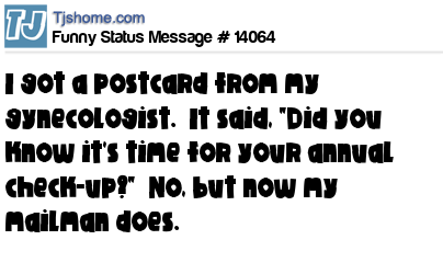 X says I got a postcard from my gynecologist. It said, "Did you know it's time for your annual check-up?" No, but now my mailman does.