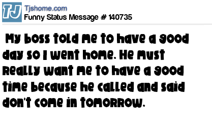X says My boss told me to have a good day so I went home. He must really want me to have a good time because he called and said don't come in tomorrow.