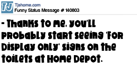 - # 193593 Thanks to me, you'll probably start seeing 'For Display Only' signs on the toilets at Home Depot.