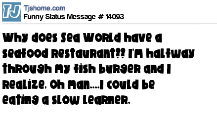 X says Why does Sea World have a seafood restaurant?? I'm halfway through my fish burger and I realize, Oh man....I could be eating a slow learner.