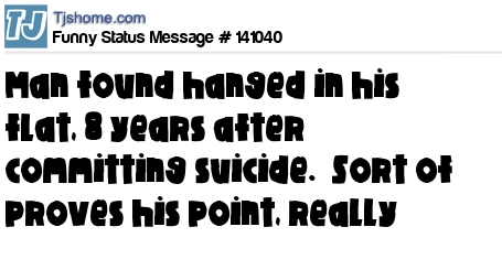 - # 172998 Man found hanged in his flat, 8 years after committing suicide. Sort of proves his point, really.......