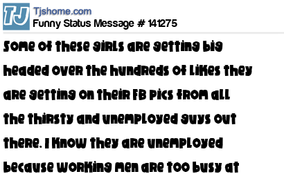X says Some of these girls are getting big headed over the hundreds of likes they are getting on their FB pics from all the thirsty and unemployed guys out there. I know they are unemployed because working men are too busy at their jobs to be stalking anyone.