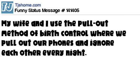 - # 182042 My wife and I use the pull-out method for birth control ....we pull out our phones and ignore each other all night.