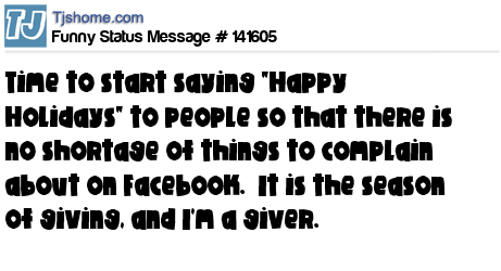 X Time to start saying "Happy Holidays" to people so that there is no shortage of things to complain about on Facebook. It is the season of giving, and I'm a giver.