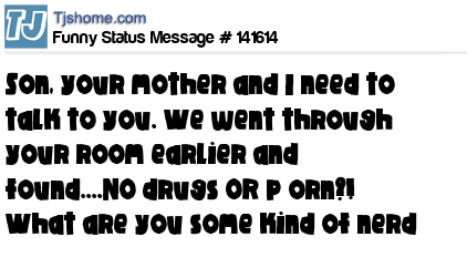 X says Son, your mother and I need to talk to you. We went through your room earlier and found....NO drugs OR p orn?! What are you some kind of nerd