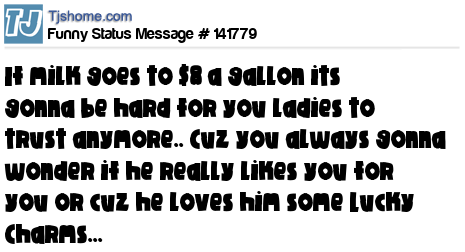 X says If milk goes to $8 a gallon its gonna be hard for you ladies to trust anymore.. Cuz you always gonna wonder if he really likes you for you or cuz he loves him some Lucky Charms...